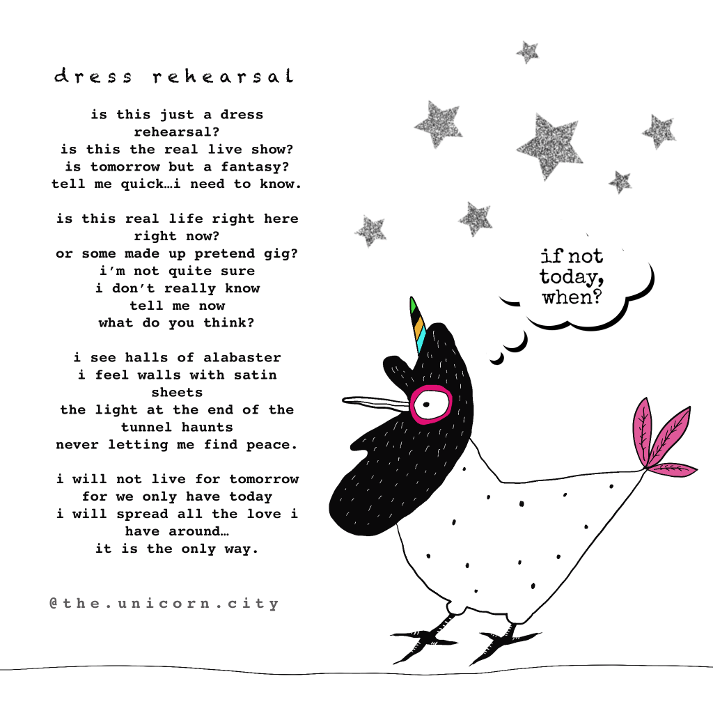 i read a line in a book i started reading – it asked if we are going through life as if it is a dress rehearsal. i thought about that. in some ways, yes, it feels like it. like we are waiting for someone to rescue us or to sprinkle a million dollars all around or to hand us the magic wand that will undo all that we’ve done. 💥 surprise! 💥 we are in the thick of act two of The Play Called Your Life right now. act three may be short. or long. or…who knows?
